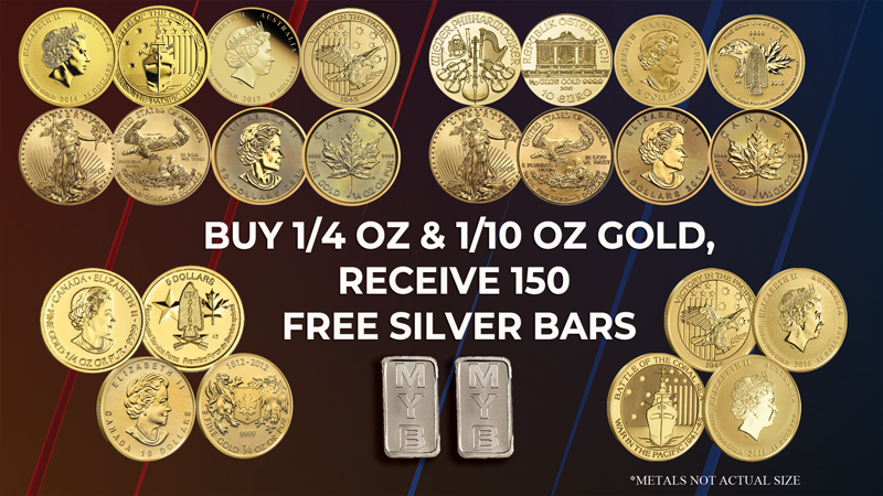With every purchase of five (5) 1/4 ounce gold coins and five (5) 1/10 ounce gold coins of your choice, you will receive one hundred and fifty (150) Mind Your Business silver bars at no additional charge. You may mix and match a wide variety of 1/4 ounce and 1/10 ounce gold coins. Please call your Account Executive to find out which gold coins qualify. Please note, this offer does not qualify for IRA purchases.